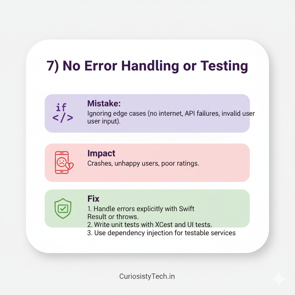 - Mistake: Skipping VoiceOver, Dynamic Type, and contrast checks.