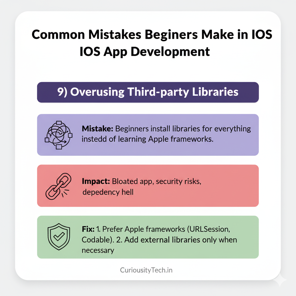 - Mistake: Beginners install libraries for everything (networking, JSON parsing, UI widgets) instead of learning Apple frameworks.