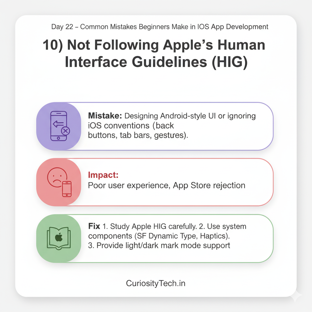 - Mistake: Designing Android-style UI or ignoring iOS conventions (back buttons, tab bars, gestures).