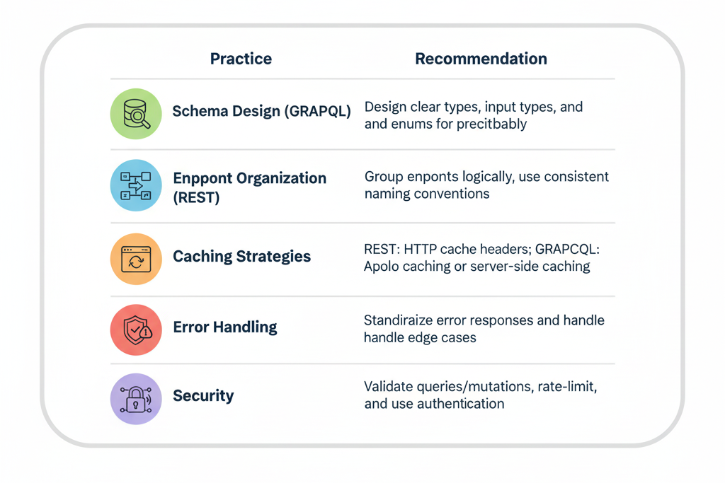 | Schema Design (GraphQL) | Design clear types, input types, and enums for predictability |