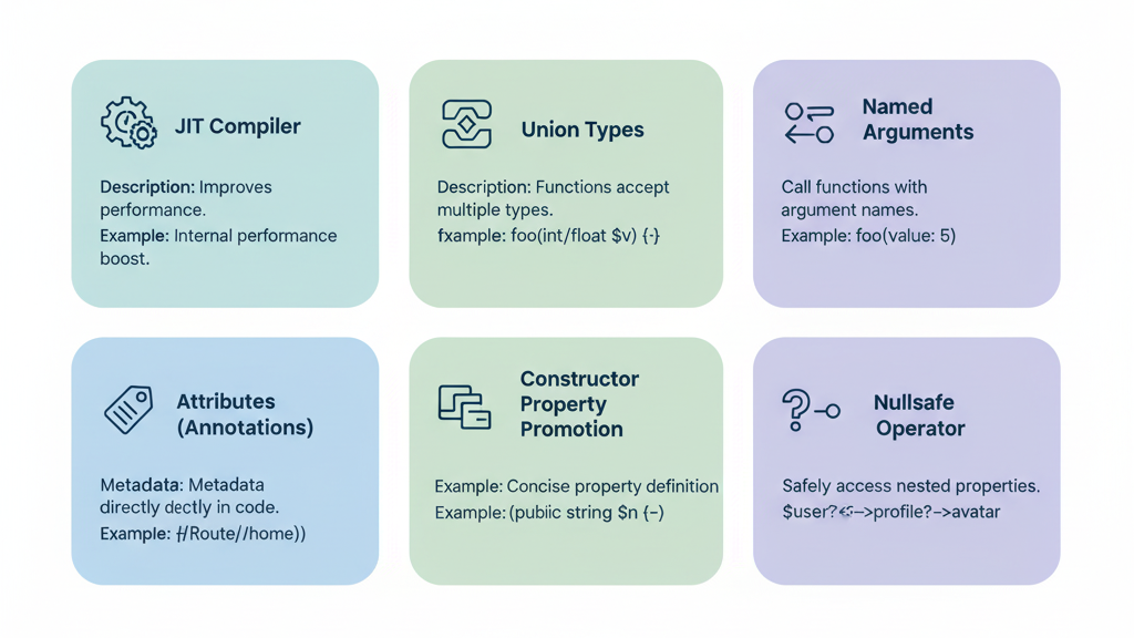 | Constructor Property Promotion | Concise property definition in classes | public function __construct(private string $name) {} |