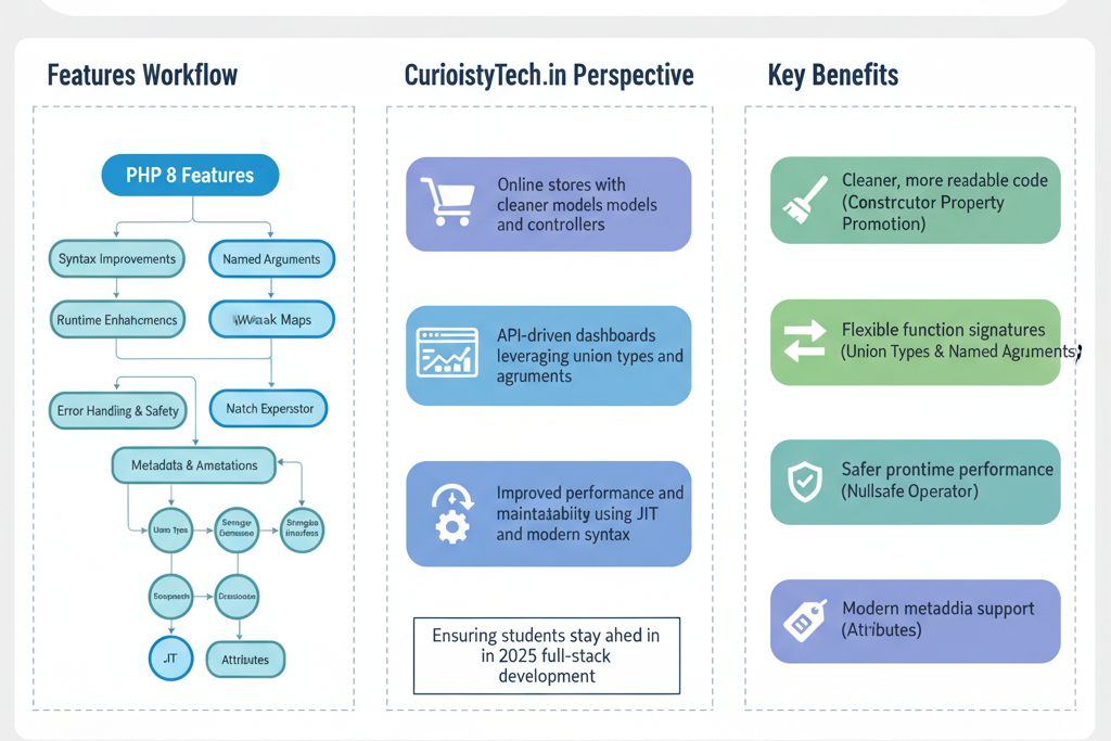 CuriosityTech.in emphasizes combining PHP 8 features with Laravel projects to maximize both performance and code quality.