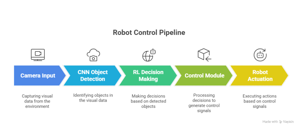 - Control Module: PID or RL policy drives arm actuators to pick and place objects