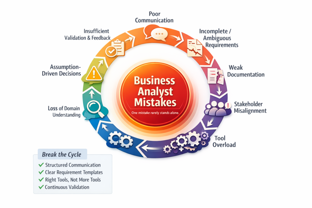 Mistakes are inevitable, but repeating them is not. As a Business Analyst, your role is not only about gathering requirements—it’s about bridging people, processes, and technology with precision. By avoiding the common mistakes discussed here, you move closer to becoming a world-class BA.