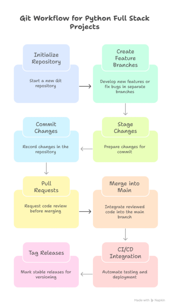 Version control is the backbone of modern software development. In Python Full Stack projects, where multiple developers collaborate on frontend, backend, and database layers, Git ensures code consistency, traceability, and collaboration.