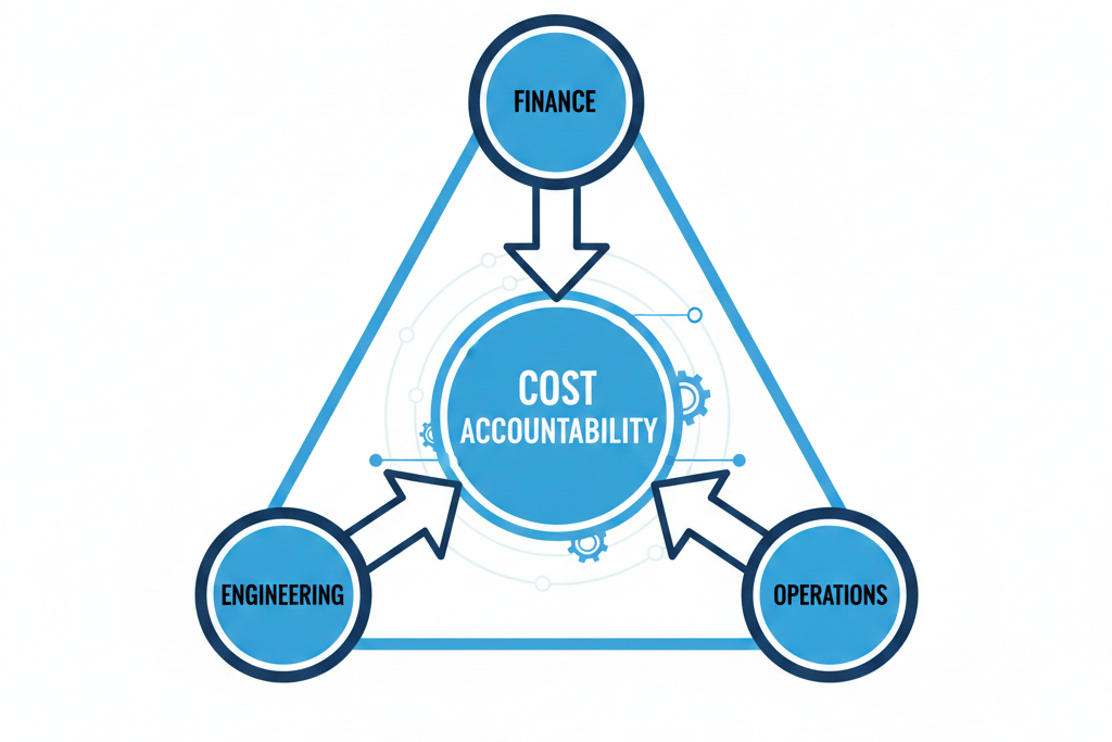 A triangle showing Engineering, Finance, and Operations converging at “Cost Accountability”.