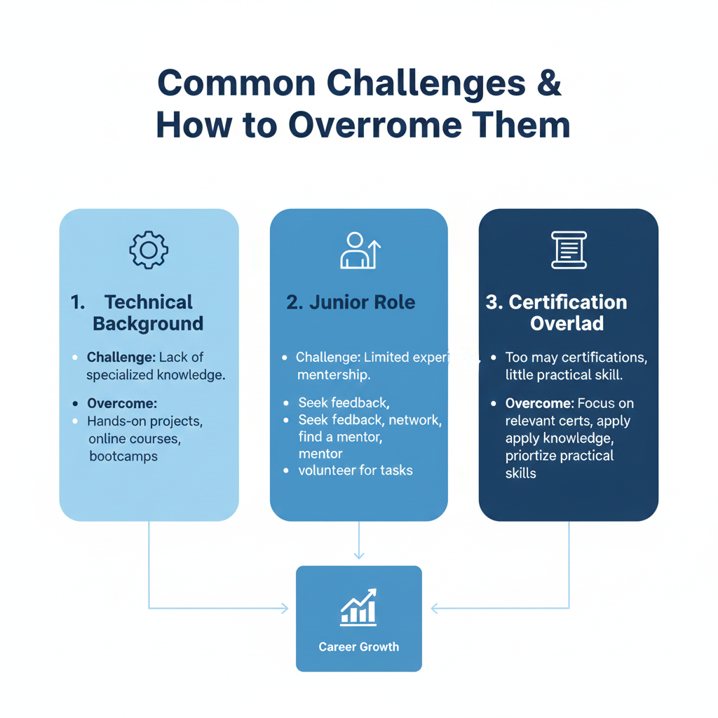 - Solution: Take initiative—volunteer for projects, mentor others, and learn domain expertise.