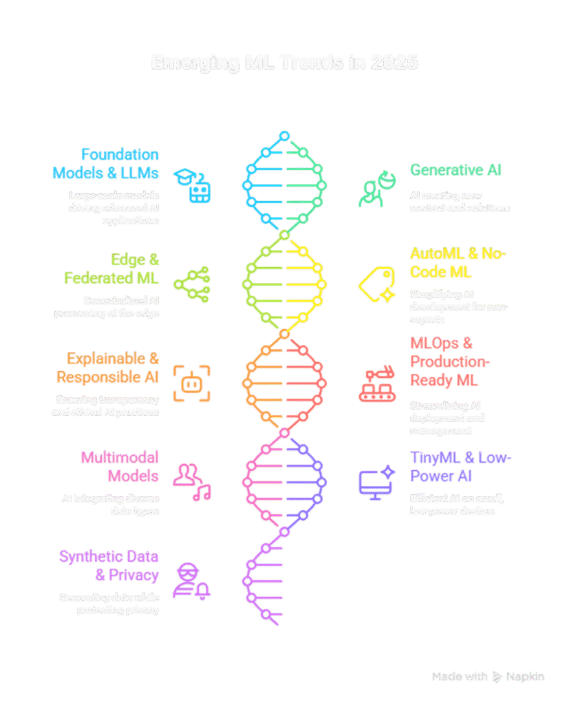 Visual Description: Central node “ML Trends 2025” with branches to each trend, highlighting applications and tools for each.
