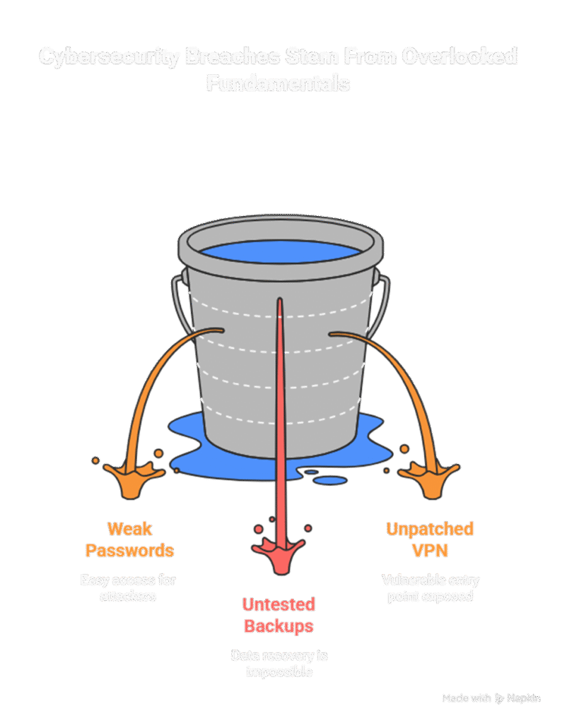A few years ago, I was called into a mid-size startup after their servers were encrypted by ransomware. They had a firewall, antivirus, and even a part-time IT consultant — yet the breach happened because of basic, avoidable mistakes: weak passwords, no backups tested, and an unpatched VPN appliance. The lesson was clear — cyber security failures often stem not from sophisticated nation-state attacks, but from overlooked fundamentals.