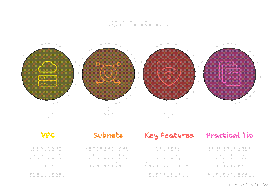 • Networking: VPC, Cloud Load Balancer, Cloud CDN, Cloud NAT