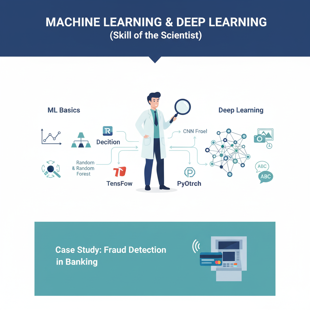 Case Study: Fraud detection in banking → ML models predict unusual transactions; DL models scan facial recognition at ATMs.