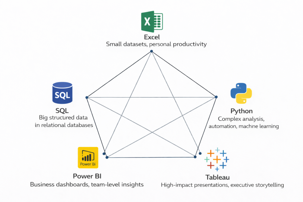 In 2025, the smartest analysts are not those who master a single tool, but those who know which tool to use for which problem. Excel, SQL, Python, Power BI, and Tableau are not competitors—they are partners in the data journey.