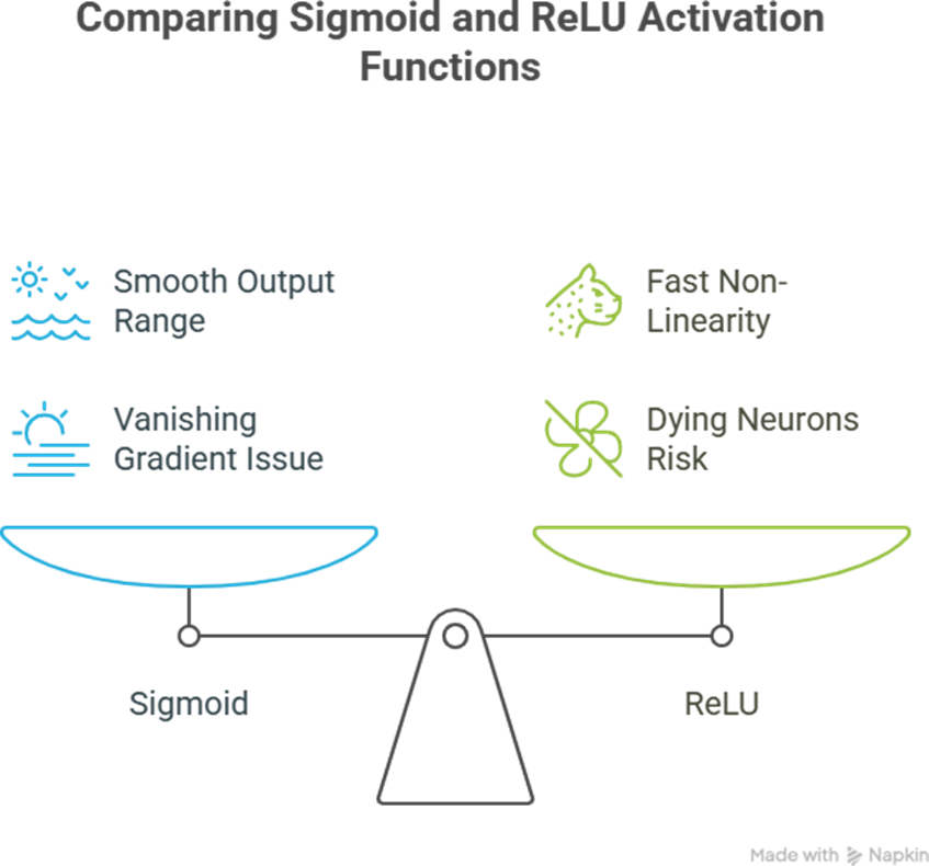 - Using Sigmoid in hidden layers → leads to vanishing gradients