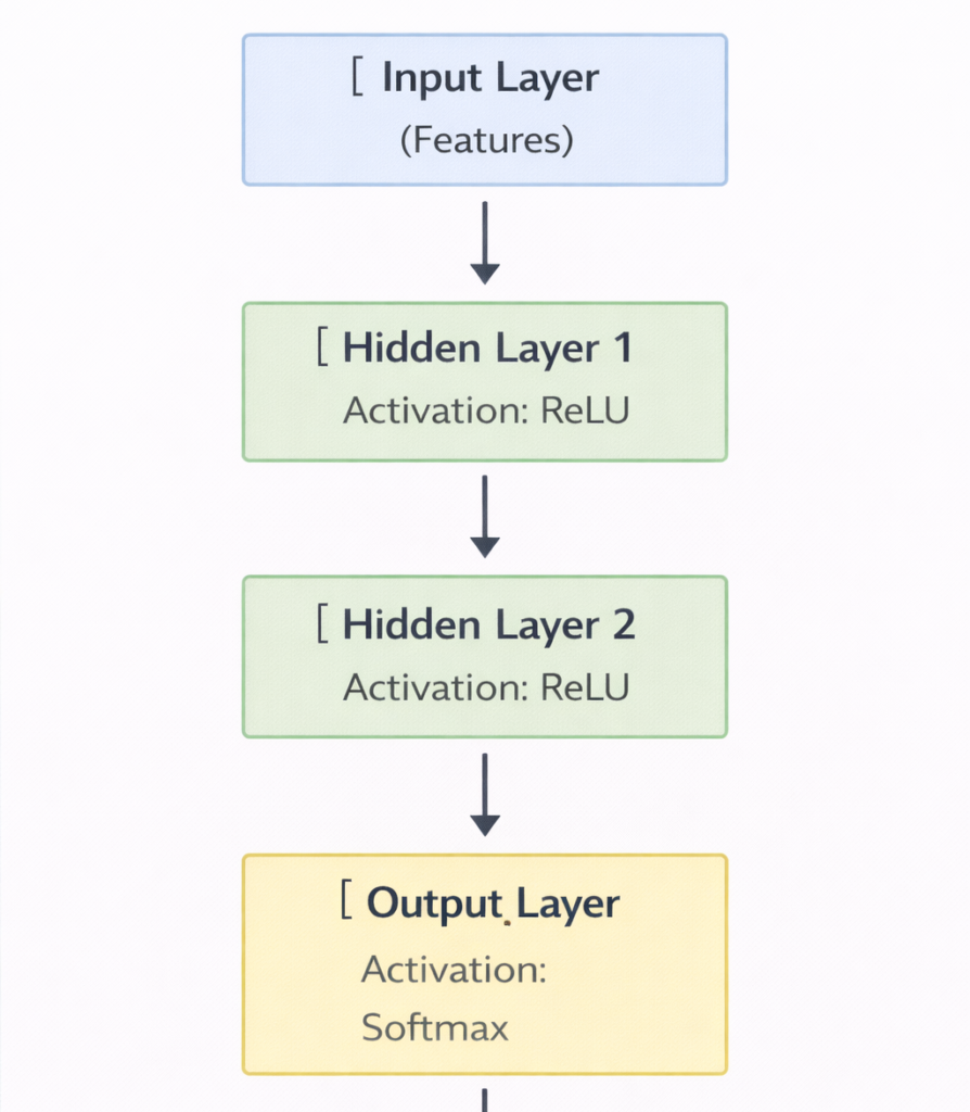 - Output layer with Softmax ensured interpretable probabilities for classification.