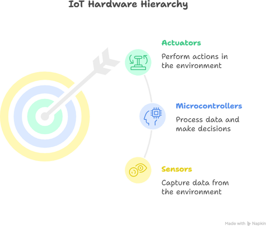 IoT is impossible without its hardware backbone. Sensors observe the environment, MCUs think and communicate, and actuators bring decisions into reality. Every IoT engineer must master these building blocks at both theoretical and practical levels. The art lies not only in choosing components but ensuring they work harmoniously under real constraints like power, accuracy, and scalability.