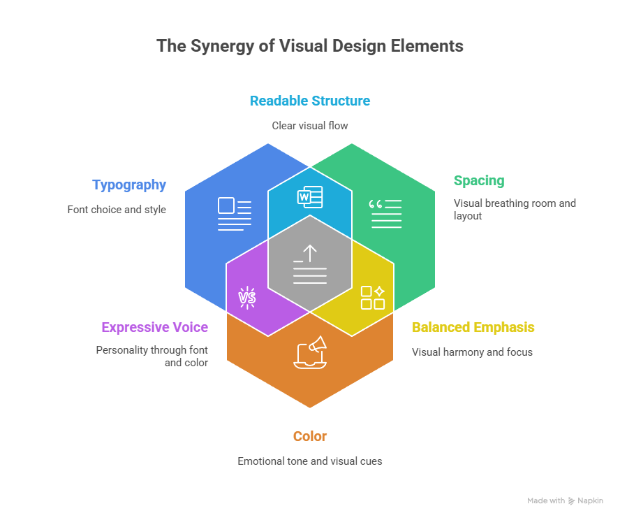 An infographic showing how typography, spacing, and color interact to guide user attention from headline to call-to-action.