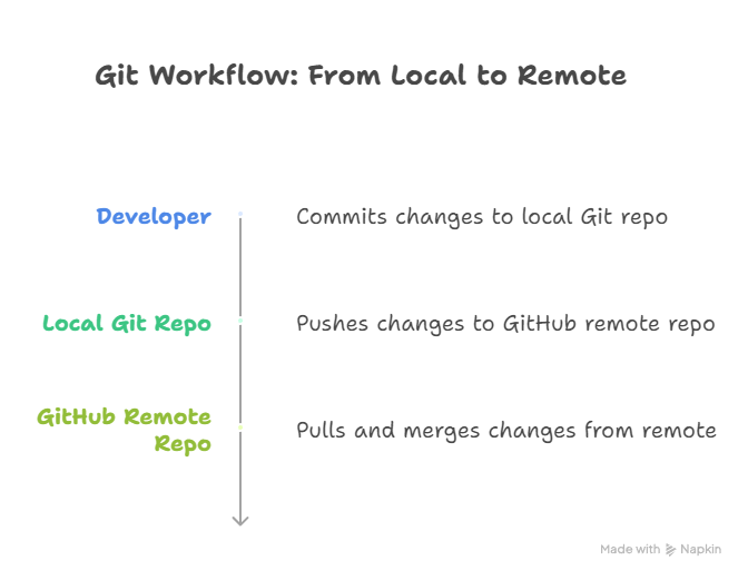 Description: This simple diagram illustrates how developers interact with local Git repositories and synchronize changes with remote repositories on GitHub, enabling seamless collaboration across teams.