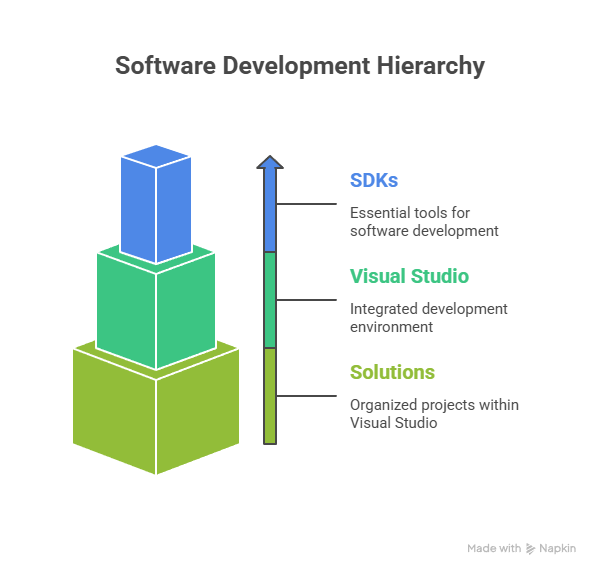 A layered diagram showing SDKs at the base, Visual Studio as the workspace, and structured solutions on top.