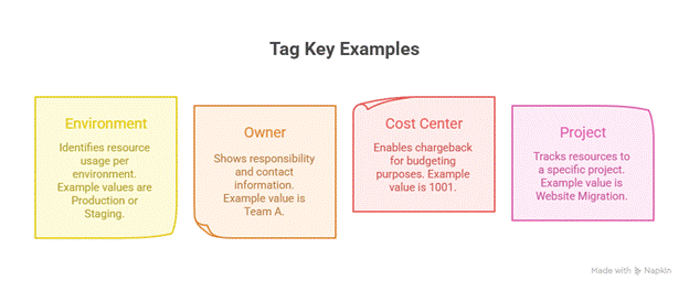 - Tagging: Apply tags like Owner, CostCenter, Environment, Project for governance.