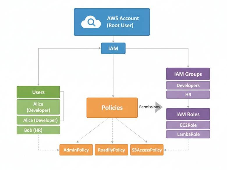 This diagram helps visualize how permissions flow from policies → roles/groups → users, making IAM structure easier to understand.