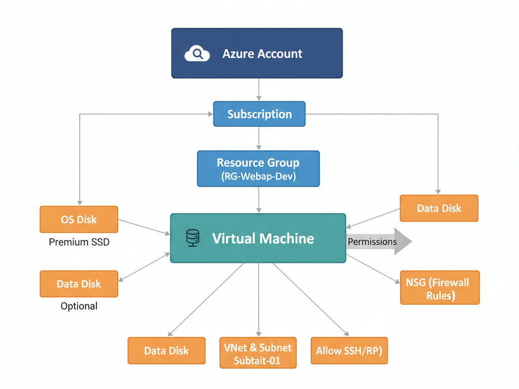 - Disks: OS disk + optional data disks. Types include SSD (premium) and HDD (standard).