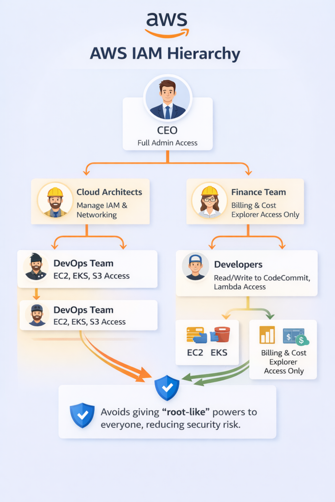 - Left Column (AWS): Shows Users → Groups → Roles → Policies.