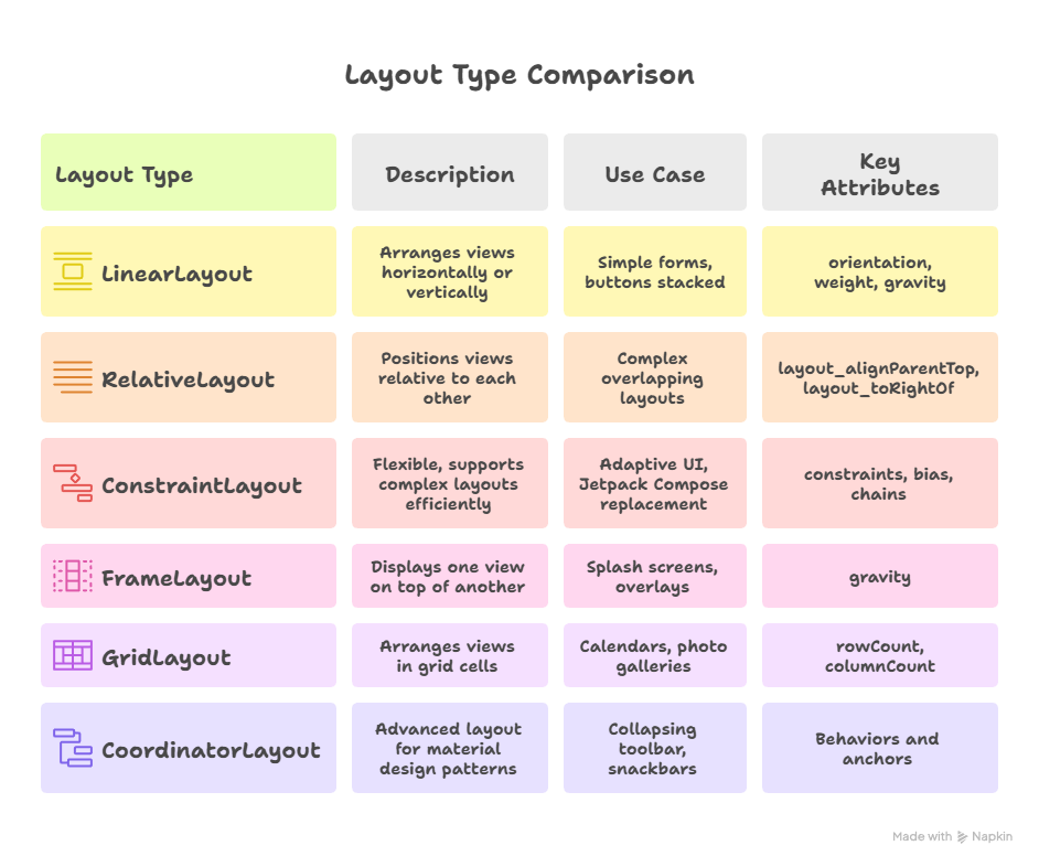 Tip: Use ConstraintLayout for most modern apps. It reduces the nested layout depth, improving performance and making responsive designs easier.