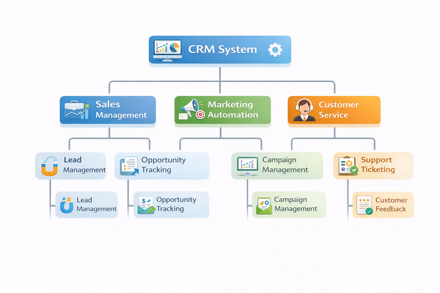 To visualize CRM structure, a hierarchical diagram can be created like this: