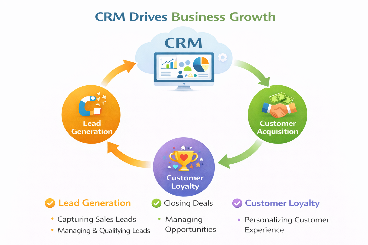 This visual makes it easier for readers to understand how CRM drives business growth from lead acquisition to long-term loyalty.