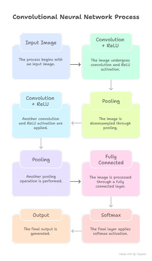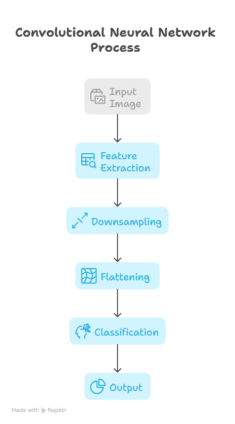 Analogy: Imagine scanning a photograph piece by piece to detect shapes. CNNs do exactly that, but with mathematical filters.