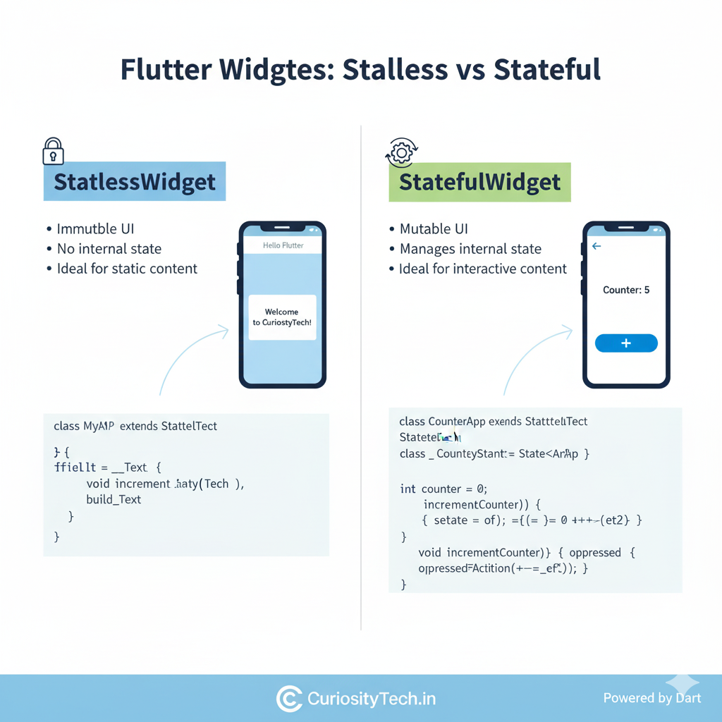 - Practice Widgets: Build small apps experimenting with Stateless & Stateful Widgets.