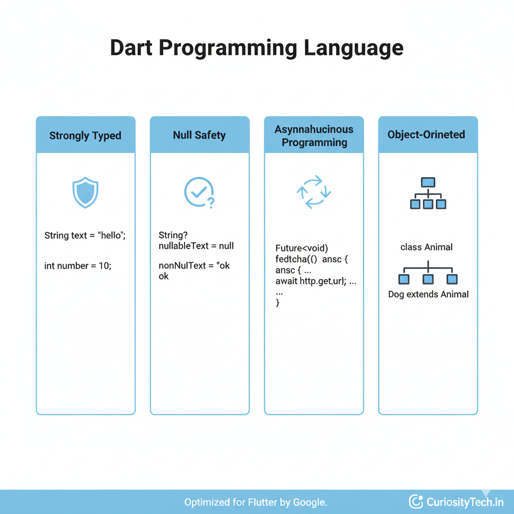 Dart is a modern, object-oriented language developed by Google. It is optimized for client-side development, making it ideal for Flutter apps.