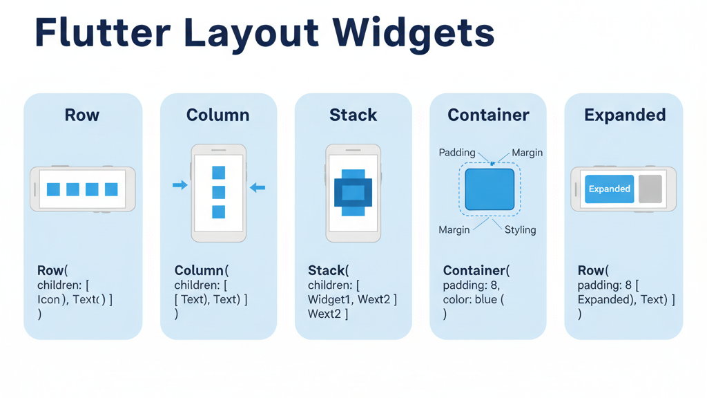 3. Learn Layouts: Explore Rows, Columns, Stack, and Container for responsive UI.