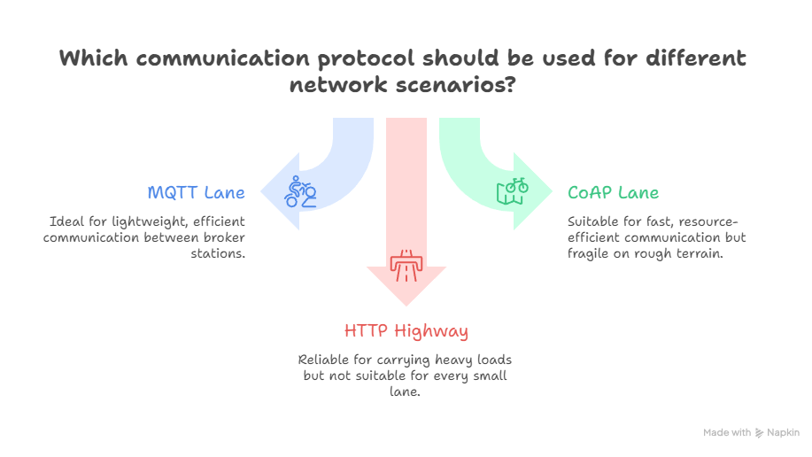 2. CoAP Lane: Bicycles on a narrow road — fast, resource-efficient, but fragile on rough terrain.