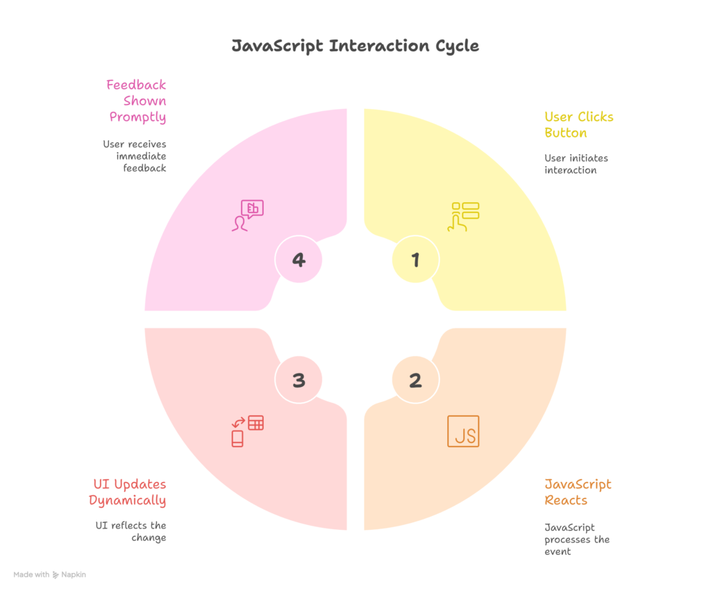 - Show a user clicking a button → JS reacts → UI updates dynamically → feedback shown.