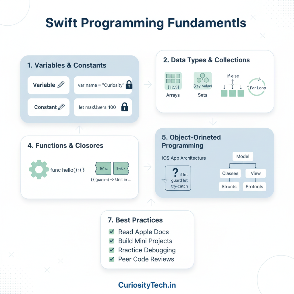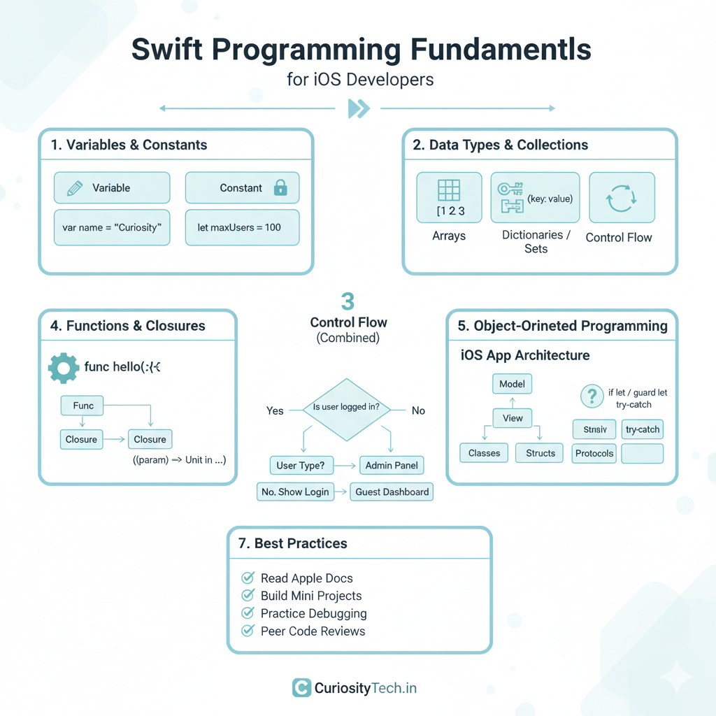Swift is the foundation of iOS app development, and mastering its fundamentals is critical for building reliable, high-performance apps. By internalizing concepts like variables, data types, control flow, functions, OOP principles, and error handling, you can progress confidently into advanced topics such as SwiftUI, CoreData, and API integration. Structured learning, practical projects, and guidance from experienced platforms like CuriosityTech.in transform beginners into professional iOS developers ready to tackle complex applications.