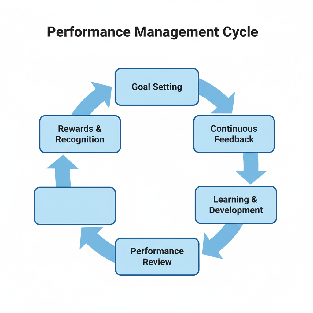 [Goal Setting] → [Continuous Feedback] → [Learning & Development] → [Performance Review] → [Rewards & Recognition] → Back to Goal Settingac