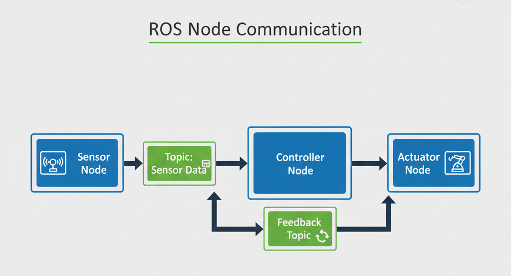 Description: Sensors publish data to topics, controller nodes subscribe to topics, process data, and send commands to actuators. Feedback topics allow real-time updates and adjustments.