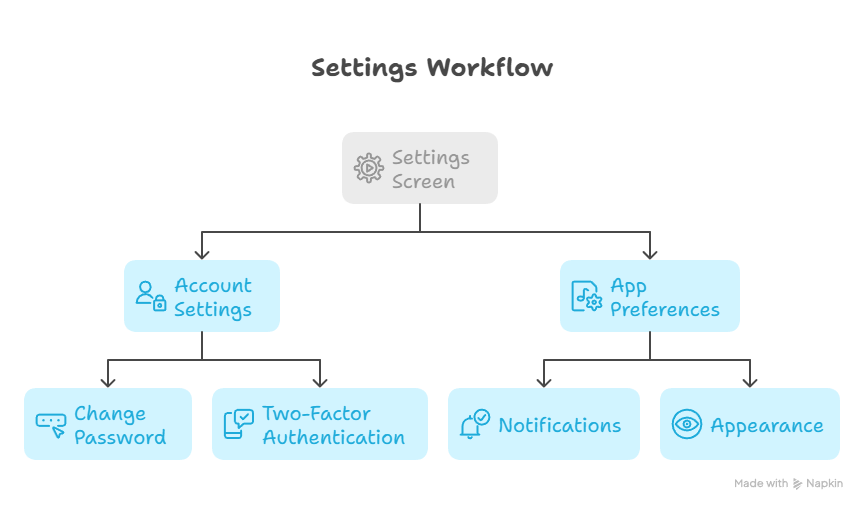 Here, the navigation controller manages the stack: when users tap “Account Settings,” the controller pushes a new screen, and users can navigate back seamlessly.