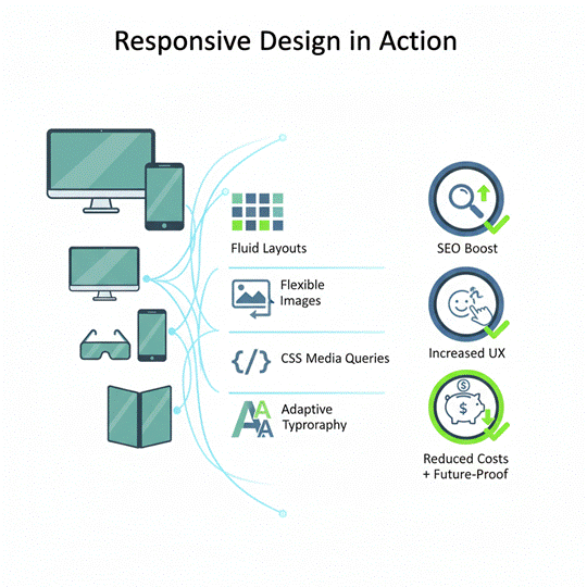 Responsive design is a web development approach that ensures your website adapts fluidly to the size and orientation of the user’s device. Instead of creating separate sites for mobile and desktop users, a responsive website uses flexible grids, layouts, images, and CSS media queries to automatically adjust the content for any screen size.