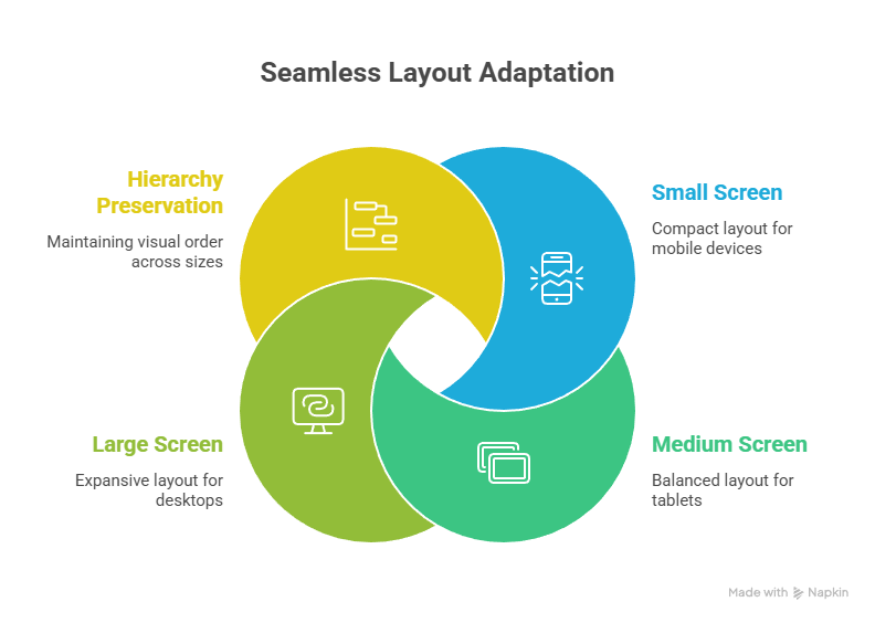 Responsive design ensures interfaces adapt fluidly to screen sizes, orientations, and resolutions.
