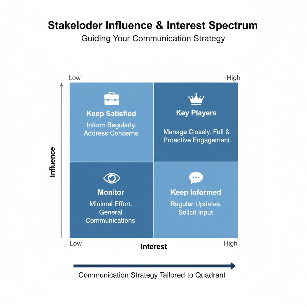Stakeholder analysis is a systematic approach to understand each stakeholder’s influence, interest, and communication needs.