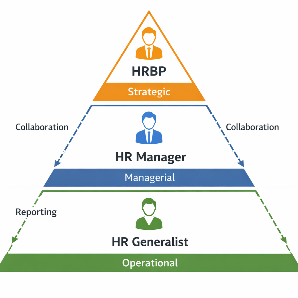 Infographic Idea: A pyramid showing HRBP at the top (strategic), HR Manager in the middle, and HR Generalist at the base (operational), with arrows indicating collaboration and reporting flow.